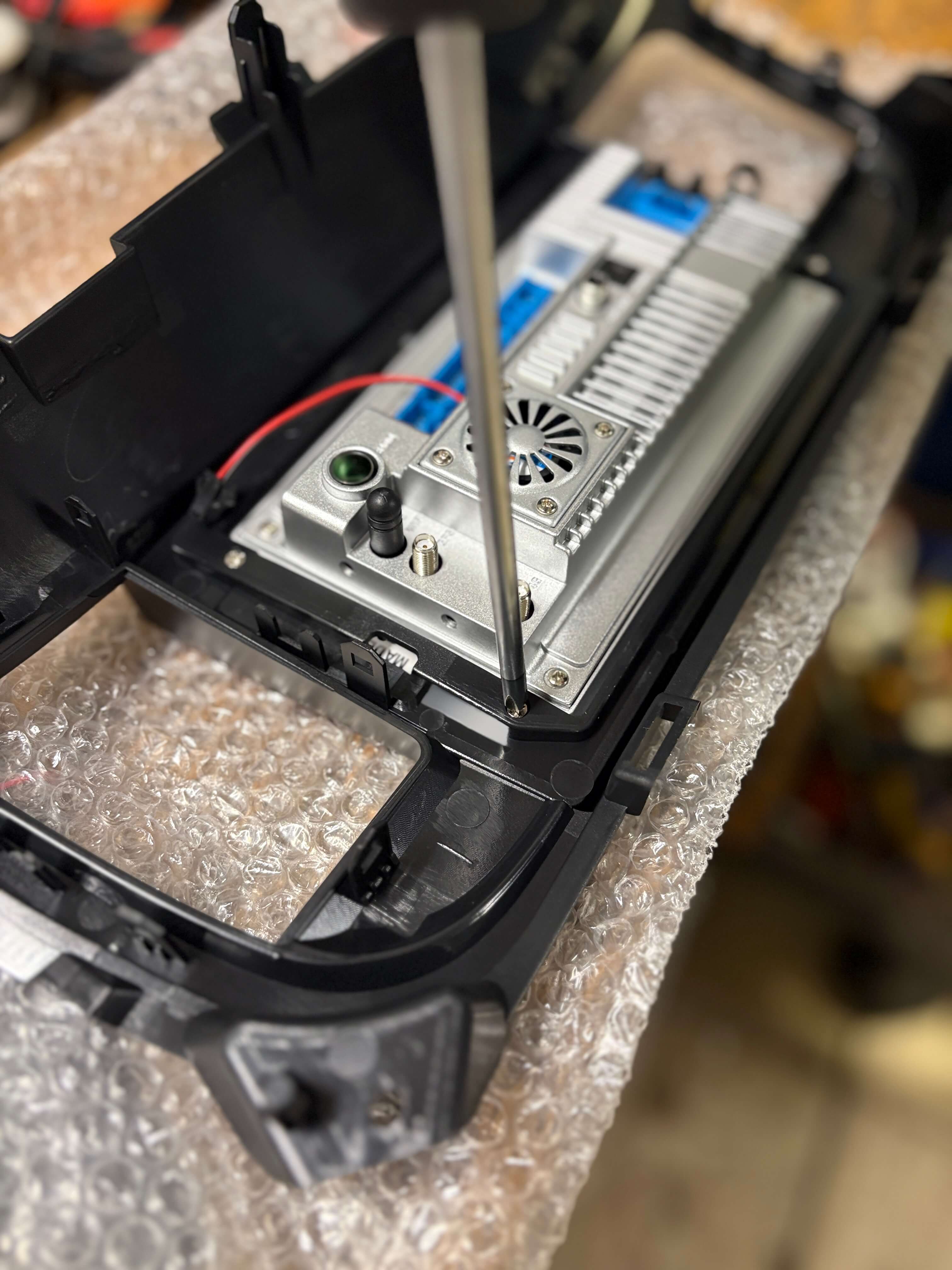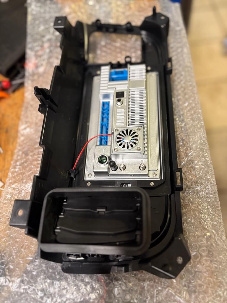 Následně jsme vyšroubovali 4 šrouby držící další plastový díl s autorádiem, respektive s displejem. Autorádio je v tomto případě ještě samostatně umístěno až za displejem. Jedná se o tu plechovou jednotku na obrázku níže. Tu je potřeba  z auta taktéž demontovat.