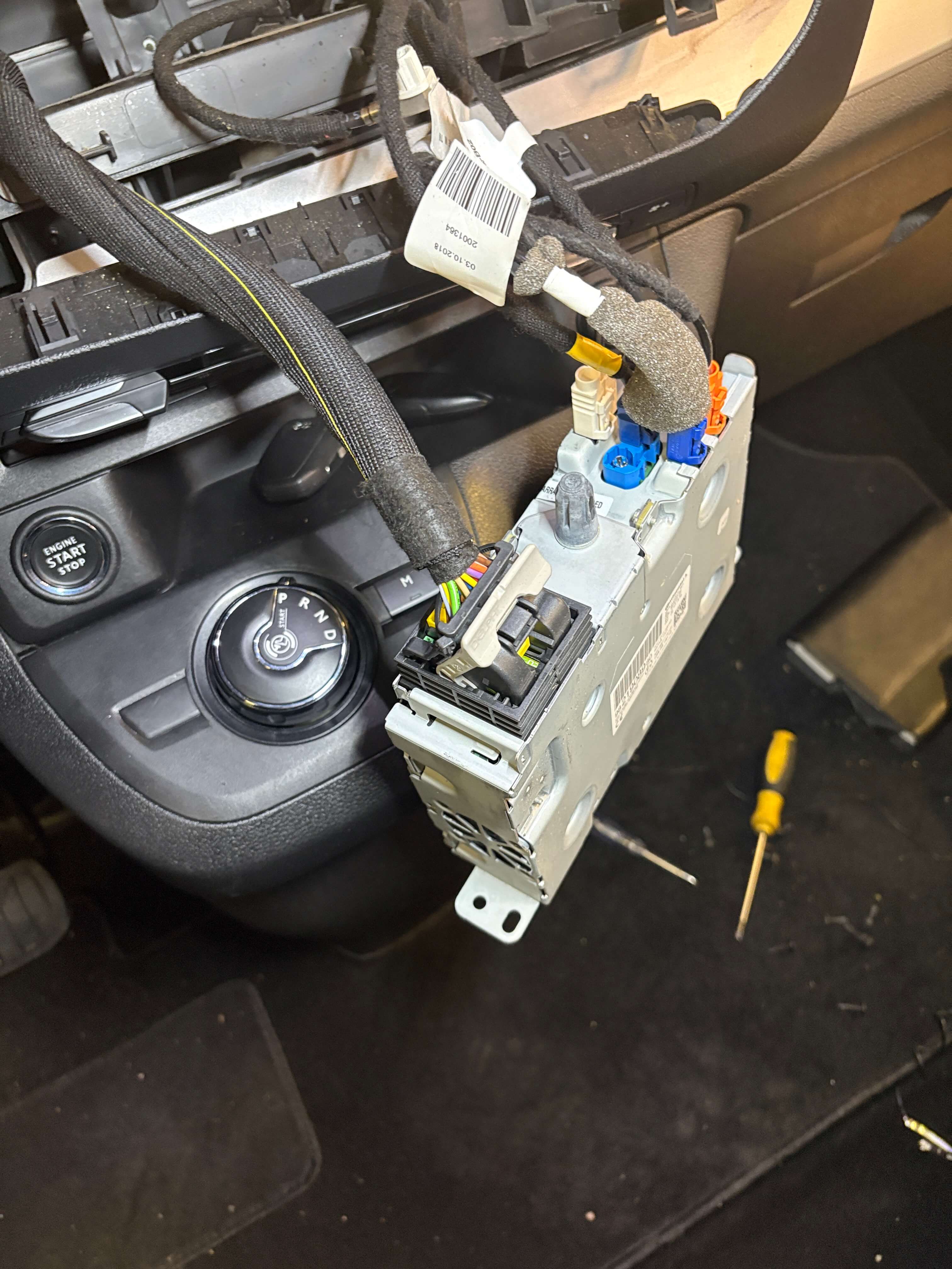 Následně jsme zapojili hlavní kabeláž, abychom mohli vyzkoušet funkčnost autorádia, než budeme pokračovat v jeho osazení do nového plastového rámečku.