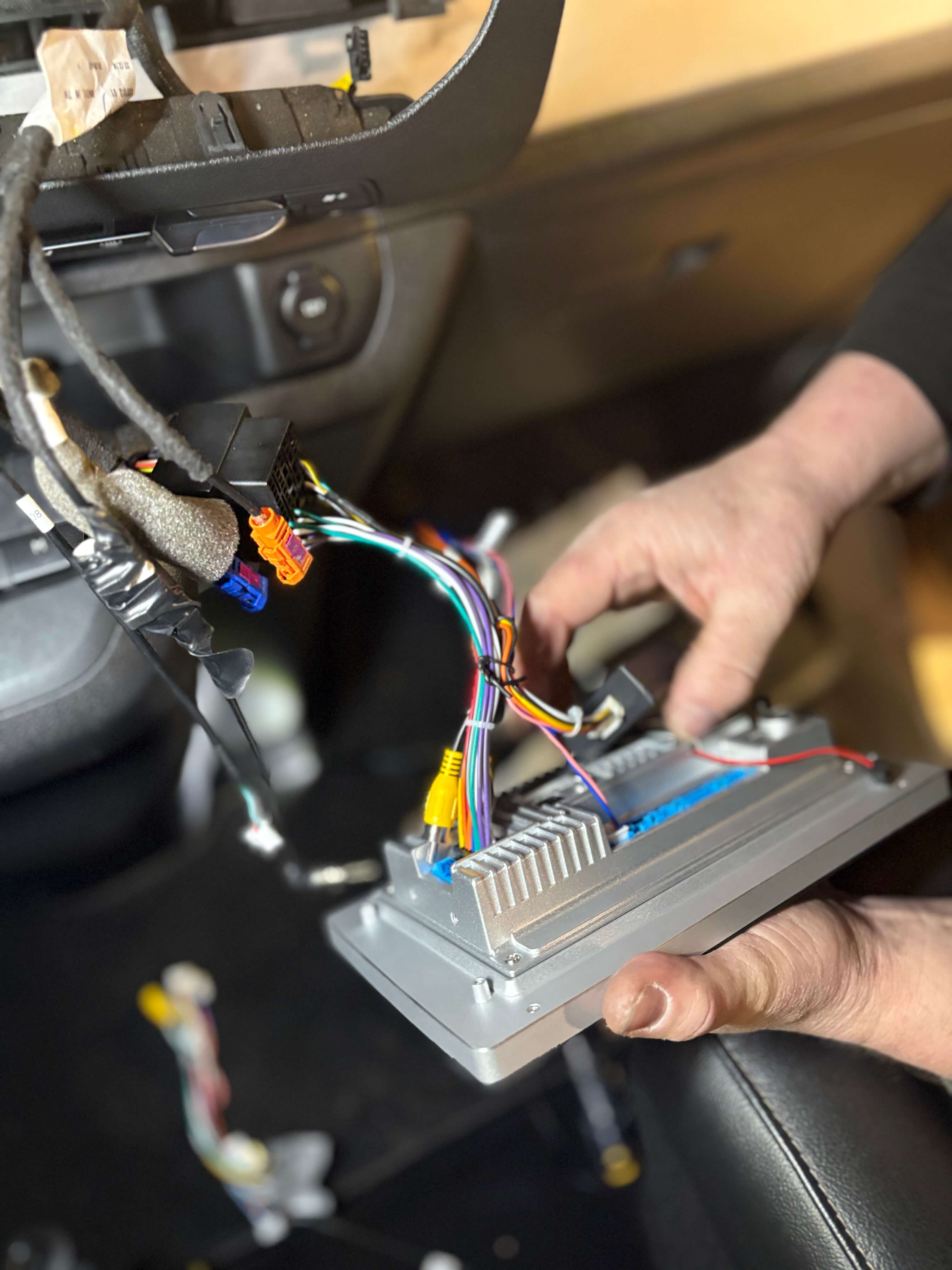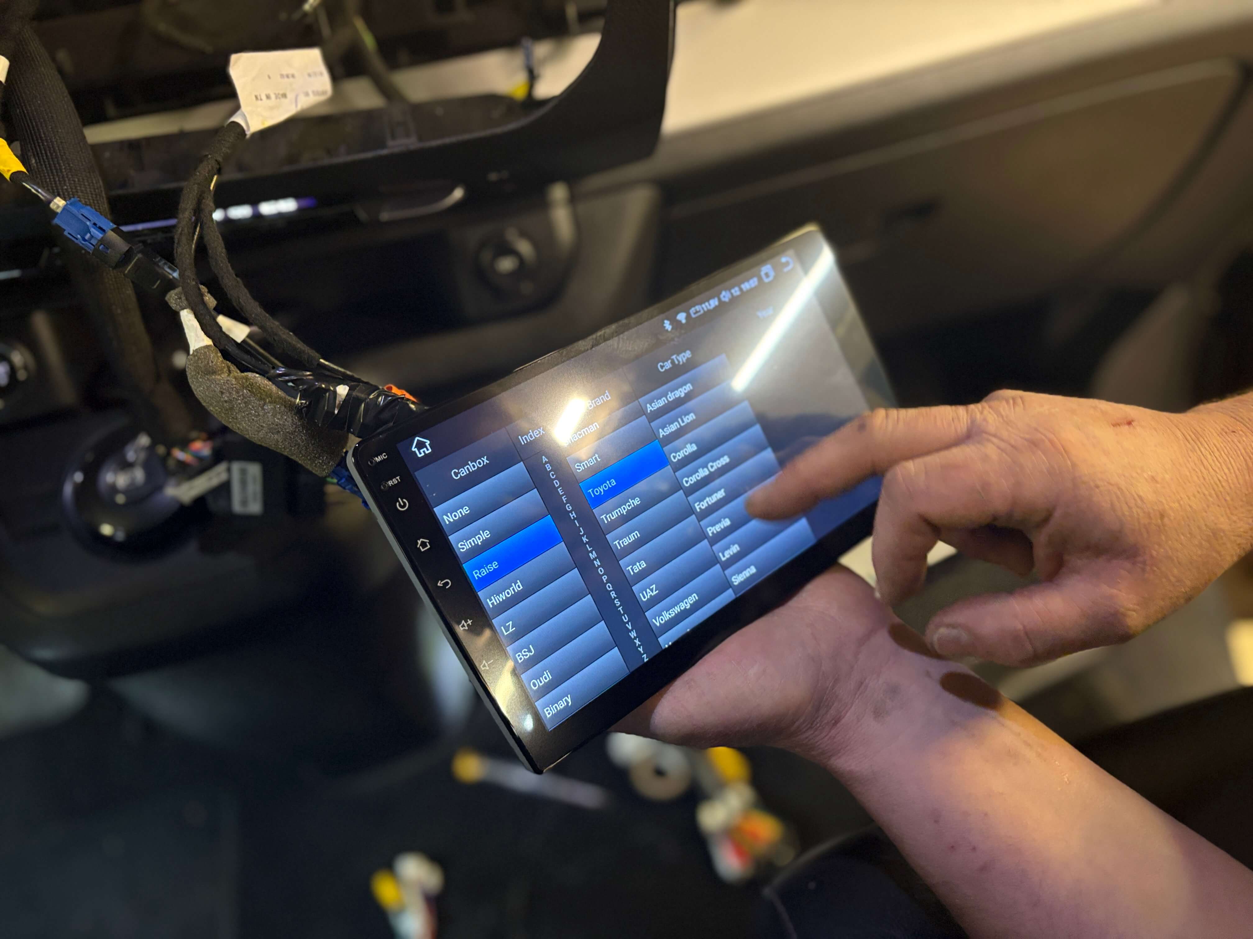 Když je autorádio připojeno k internetu, je možné programovat canbusové připojení. K spojení autorádia a canbusové sítě vozu slouží canbusový převodník - ta malá černá krabička, kterou drží mechanik v ruce na fotce výše. Převodník je ale univerzální pro všechna auta, proto je potřeba mu přes rádio "říct", jaké kódy má číst a jak je správně posílat do autorádia.