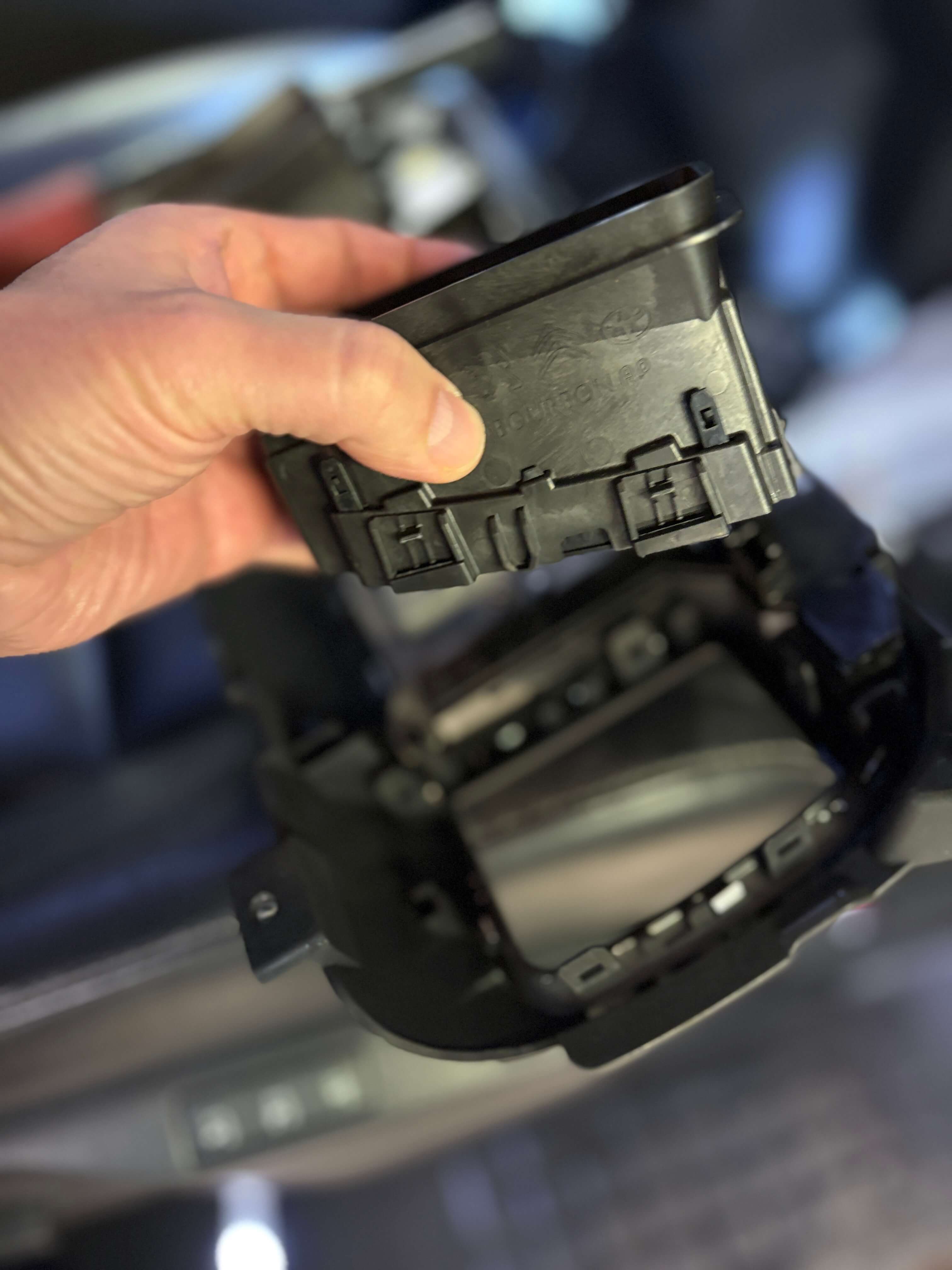 Když bylo vše nastaveno, autorádio jsme z auta odpojili a našroubovali jej do nového plastového dílu. Do tohoto nového rámečku pak bylo potřeba nacvaknout také výdechy klimatizace, které jsme demontovali z původního plastu.